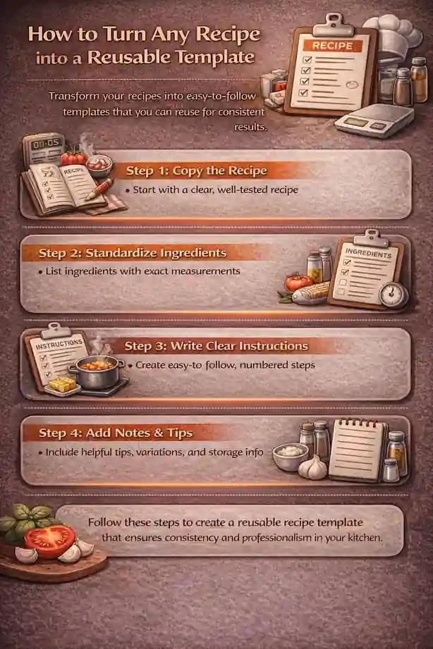 This guide shows how chefs use a recipe template to break dishes into repeatable frameworks you can apply to countless meals. You’ll learn how a recipe template helps identify the non-negotiables, swap ingredients intelligently, and adapt portions and flavors without breaking the recipe—so you can cook faster, more confidently, and with far less guesswork.