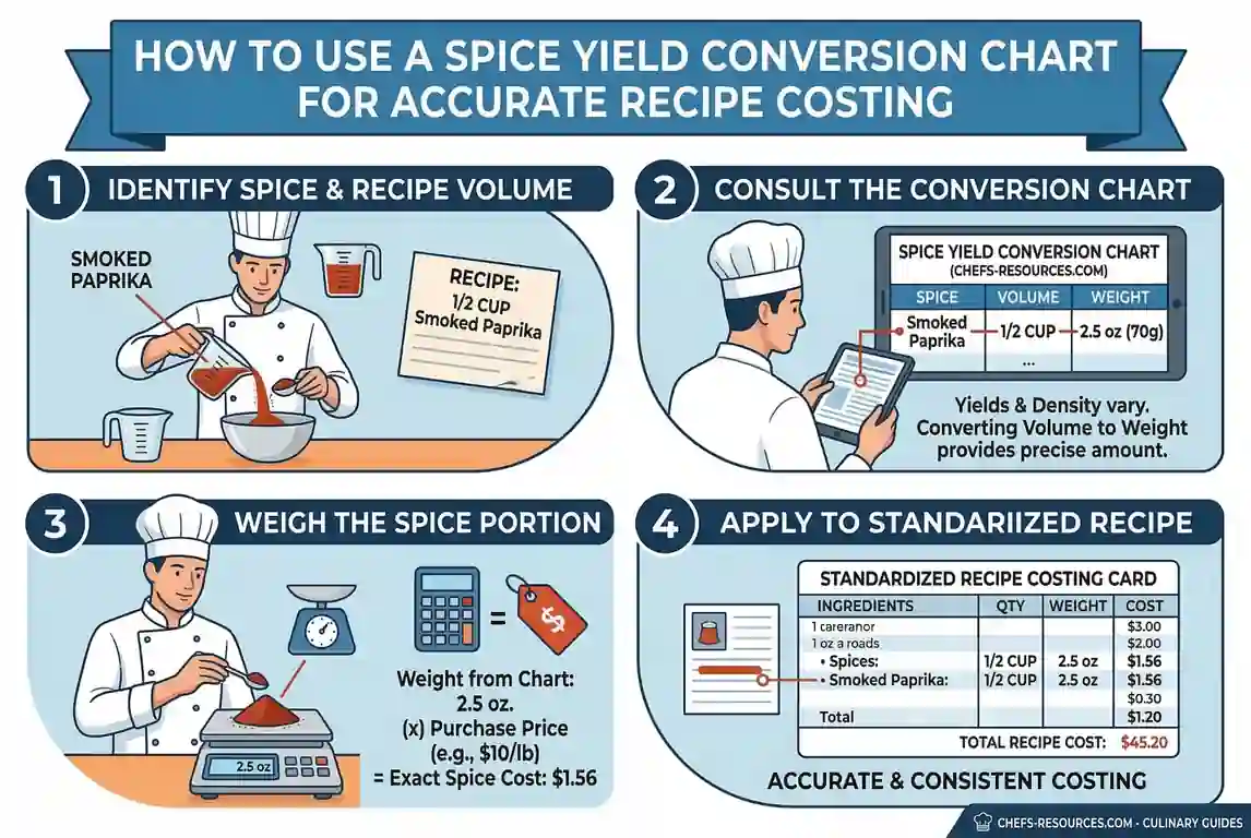 A spice yield conversion chart works best as a permanent reference embedded into your recipe costing workflow, not something you consult occasionally. The most effective approach is to build your standardized recipes with gram weights alongside or in place of volume measurements for every spice. That single change — from teaspoons to grams in your recipe documentation — removes the conversion step from the costing process entirely.